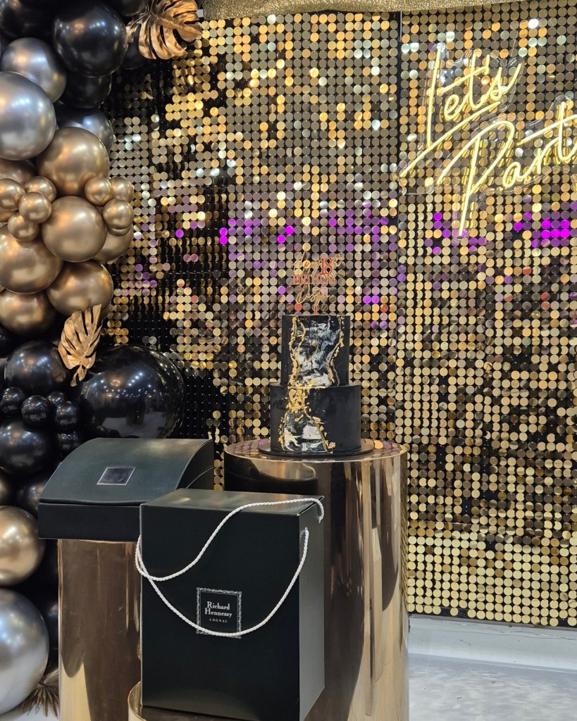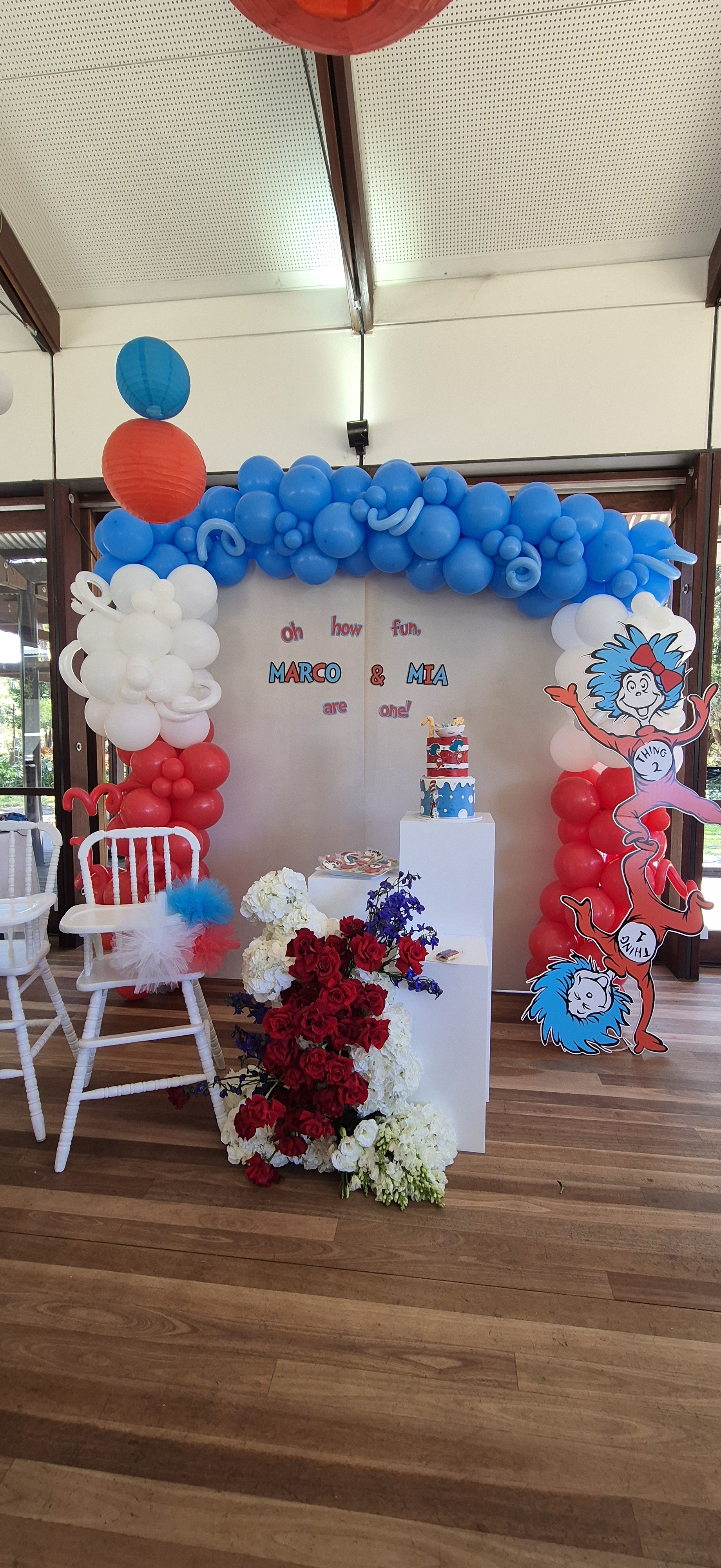 A stylish party display featuring a shimmering gold backdrop, elegant decorations, and a beautifully crafted cake.Bright and festive birthday decorations featuring balloons, a cake, and themed characters for Marco and Mia’s first birthday celebration.