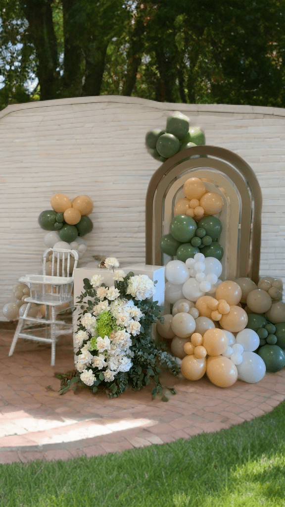 A charming outdoor setup featuring decorative balloons in earthy tones and a flower arrangement, perfect for events and celebrations.Colorful balloon decoration featuring a racing theme, perfect for a child’s birthday party.
